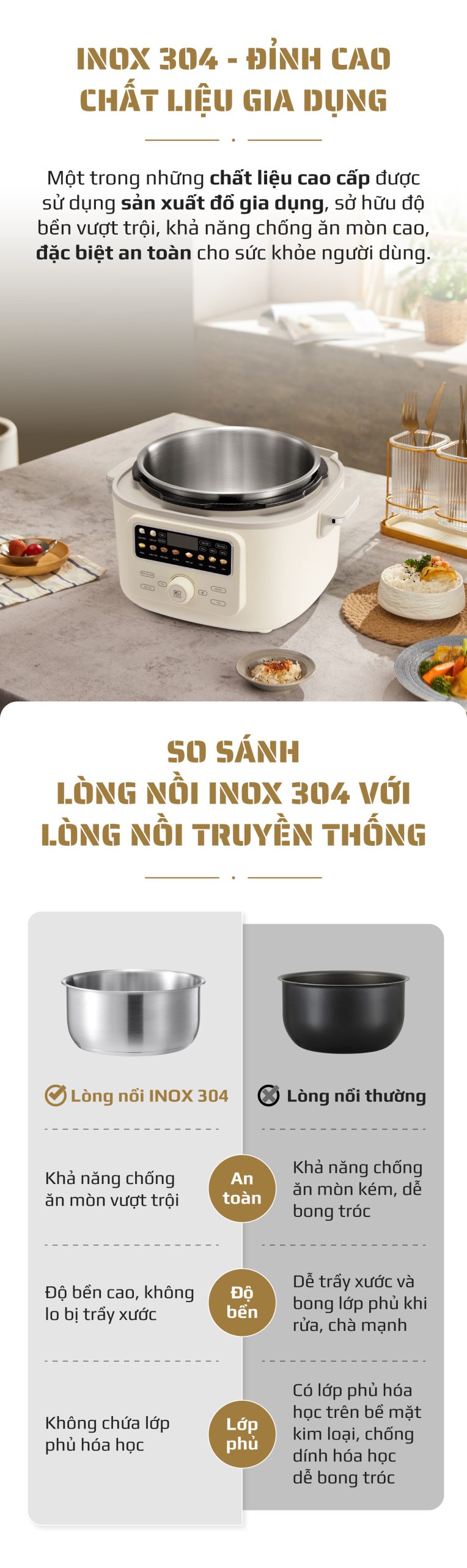 2. LÒNG NỒI INOX 304 – AN TOÀN, BỀN BỈ, TRUYỀN NHIỆT HIỆU QUẢ