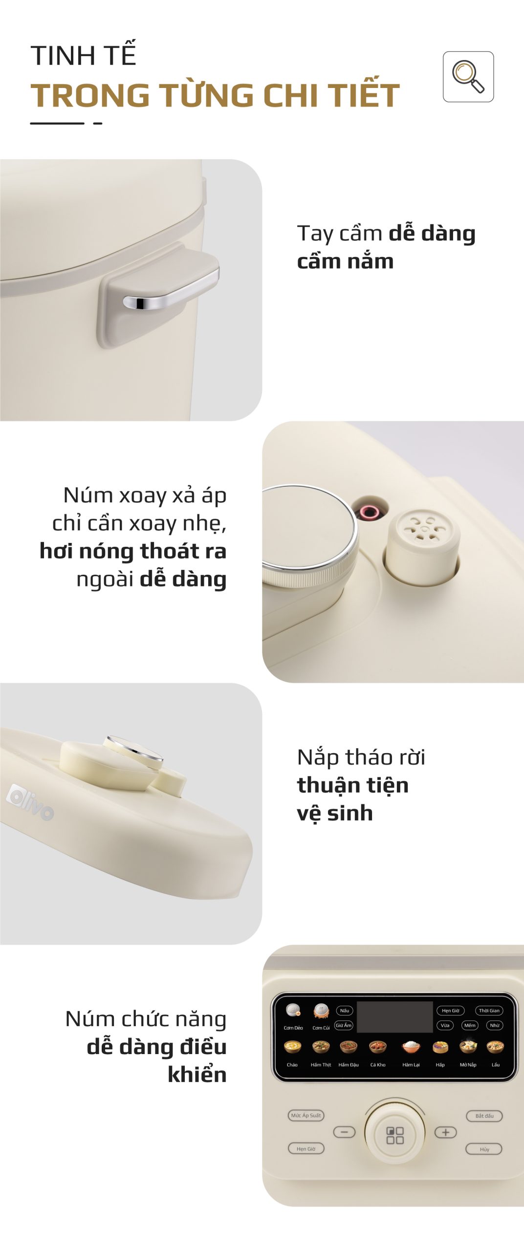 Đối với các chế độ với nấu mở nắp, OLIVO PC40 cho phép người dùng chủ động điều chỉnh 3 mức công suất nhiệt, giúp kiểm soát quá trình nấu một cách linh hoạt và chính xác hơn, phù hợp với từng món ăn và từng giai đoạn chế biến.