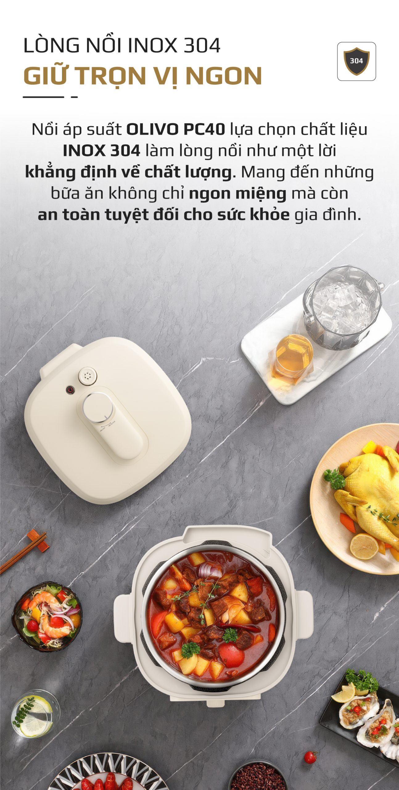 OLIVO PC40 sử dụng lòng nồi INOX 304 cao cấp, chất liệu được tin dùng trong ngành gia dụng và thực phẩm: