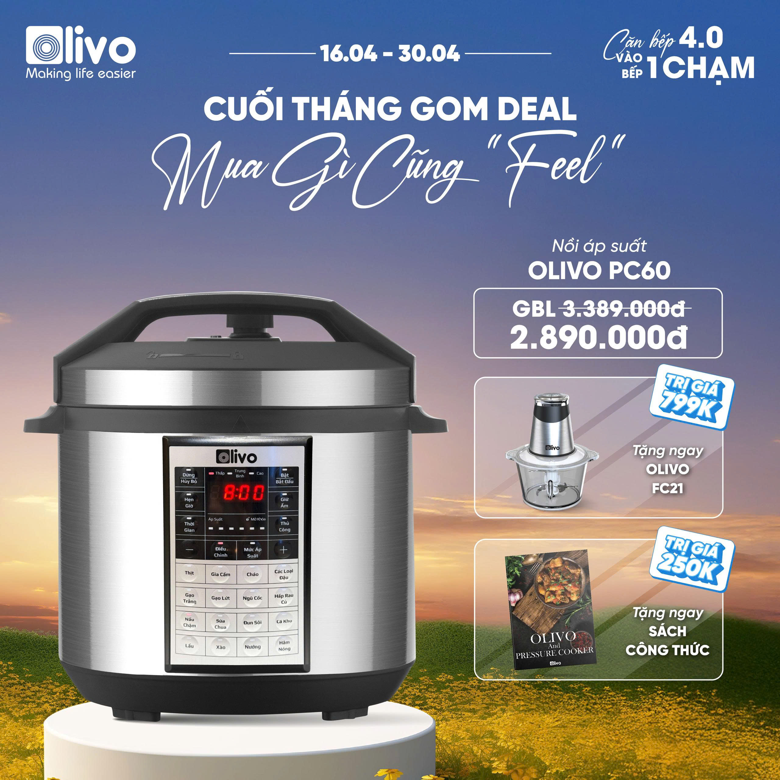 - Với cuộc sống hiện đại thì “thời gian” chính là vàng, mọi công việc như đi làm việc hay tự kinh doanh, đến việc nội trợ hàng ngày cũng chiếm rất nhiều thời gian của Chị em phụ nữ. Trong nhịp sống hối hả bận rộn này thì việc tiết kiệm thời gian nấu nướng nội trợ để có thêm thời gian nghỉ ngơi, giải trí, xả stress sau một ngày làm việc mệt mỏi là một điều cần thiết đối với mỗi Chị Em. Chính vì vậy Olivo Electronics đã nghiên cứu chế tạo và sản xuất sản phẩm nồi áp suất điện OLIVO PC60 dòng nồi áp suất điện tử vô cùng hiện đại, đa năng và an toàn bậc nhất trên thị trường hiện nay.