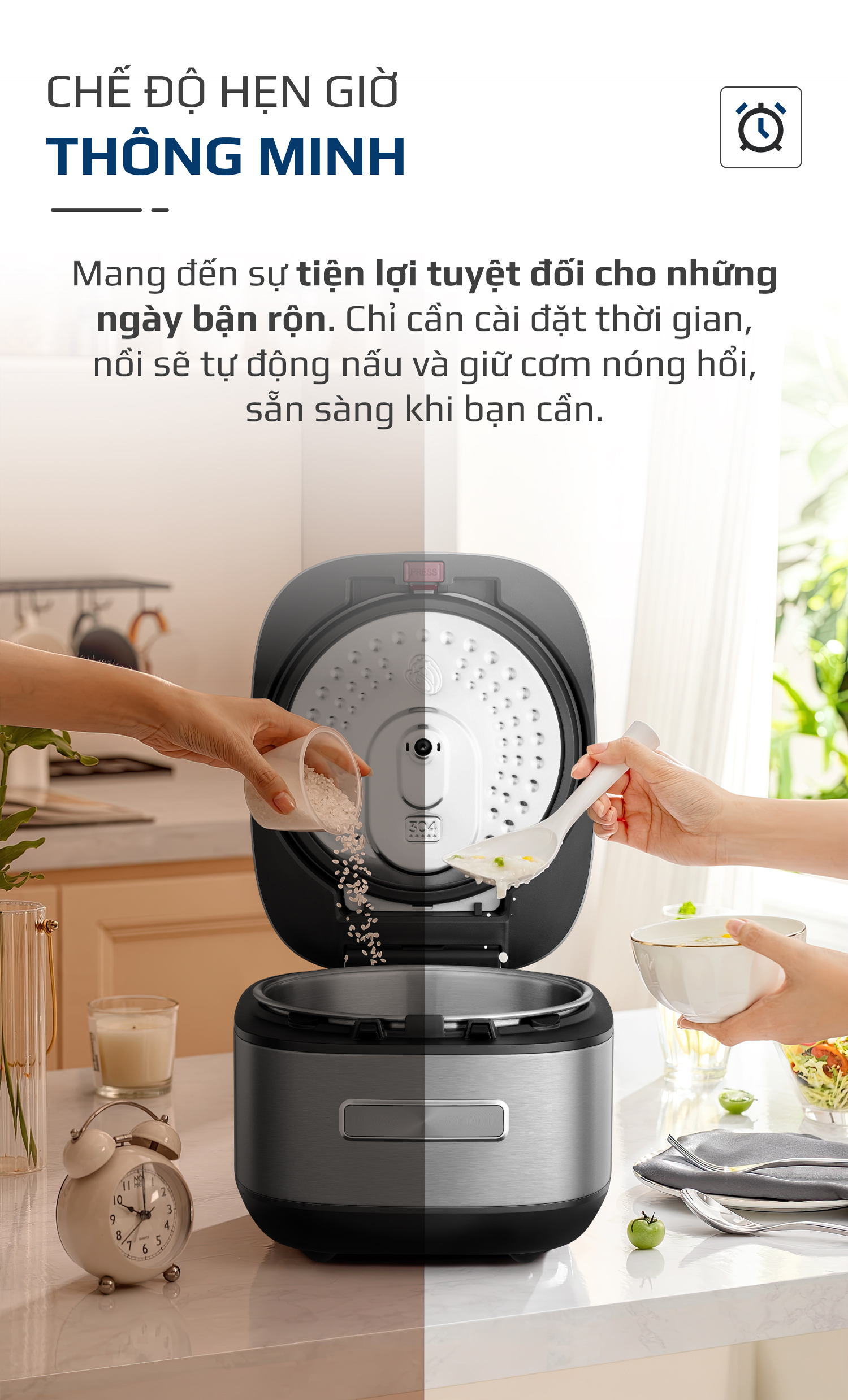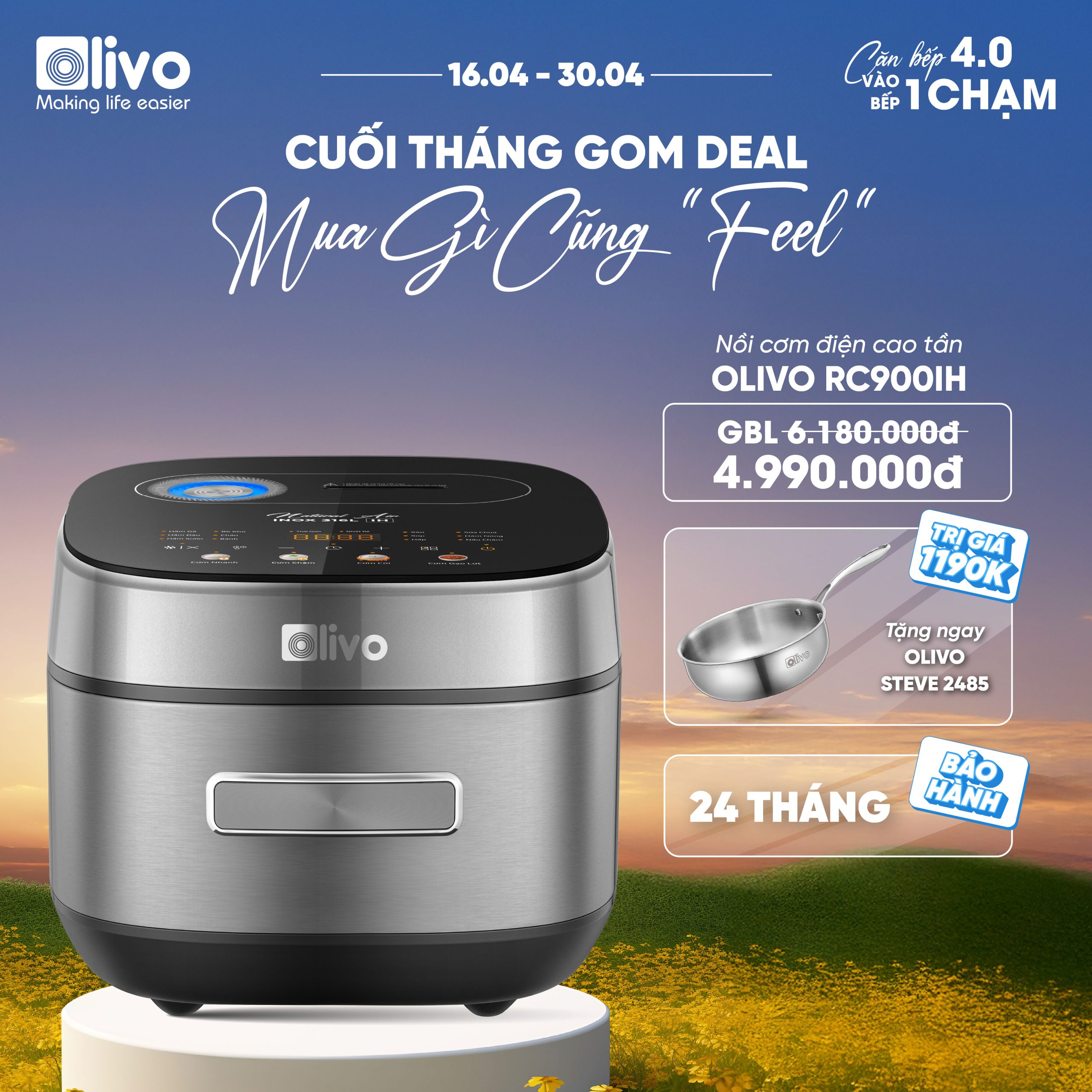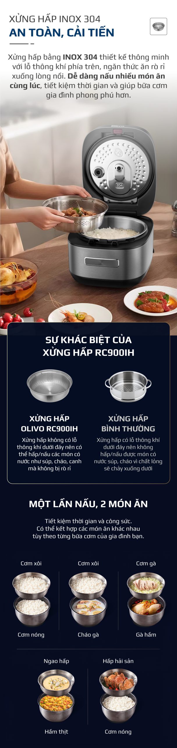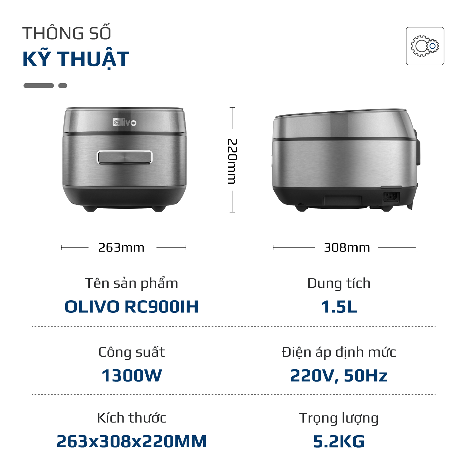 - Chiếc nồi cơm điện cao tần OLIVO RC900IH còn được trang bị thêm chức năng “Hẹn Giờ” giúp bạn chủ động trong việc nấu ăn, tiện lợi cho người bận rộn mà vẫn muốn có những bữa cơm gia đình ngon, đúng giờ, đầy đủ dinh dưỡng.