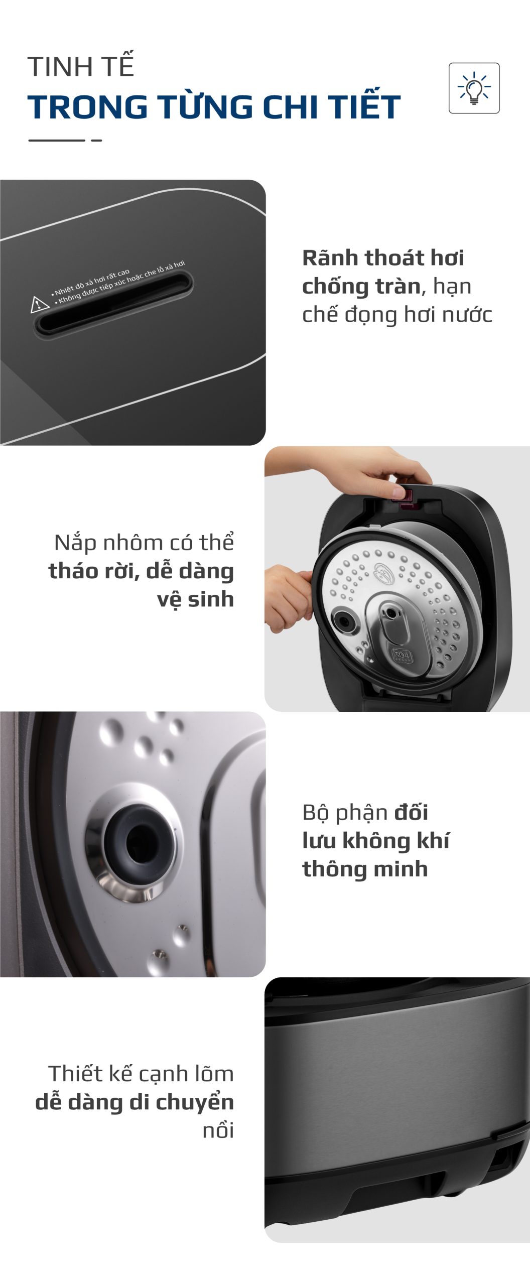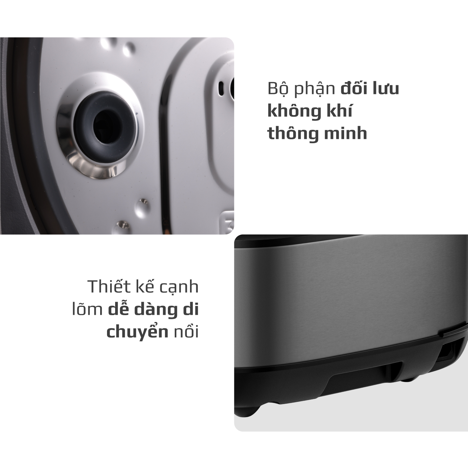 Gia nhiệt nhanh và đều: Nhiệt lượng được phân bổ đồng đều từ mọi hướng, giúp cơm chín kỹ, mềm dẻo mà vẫn giữ được độ ẩm cần thiết.