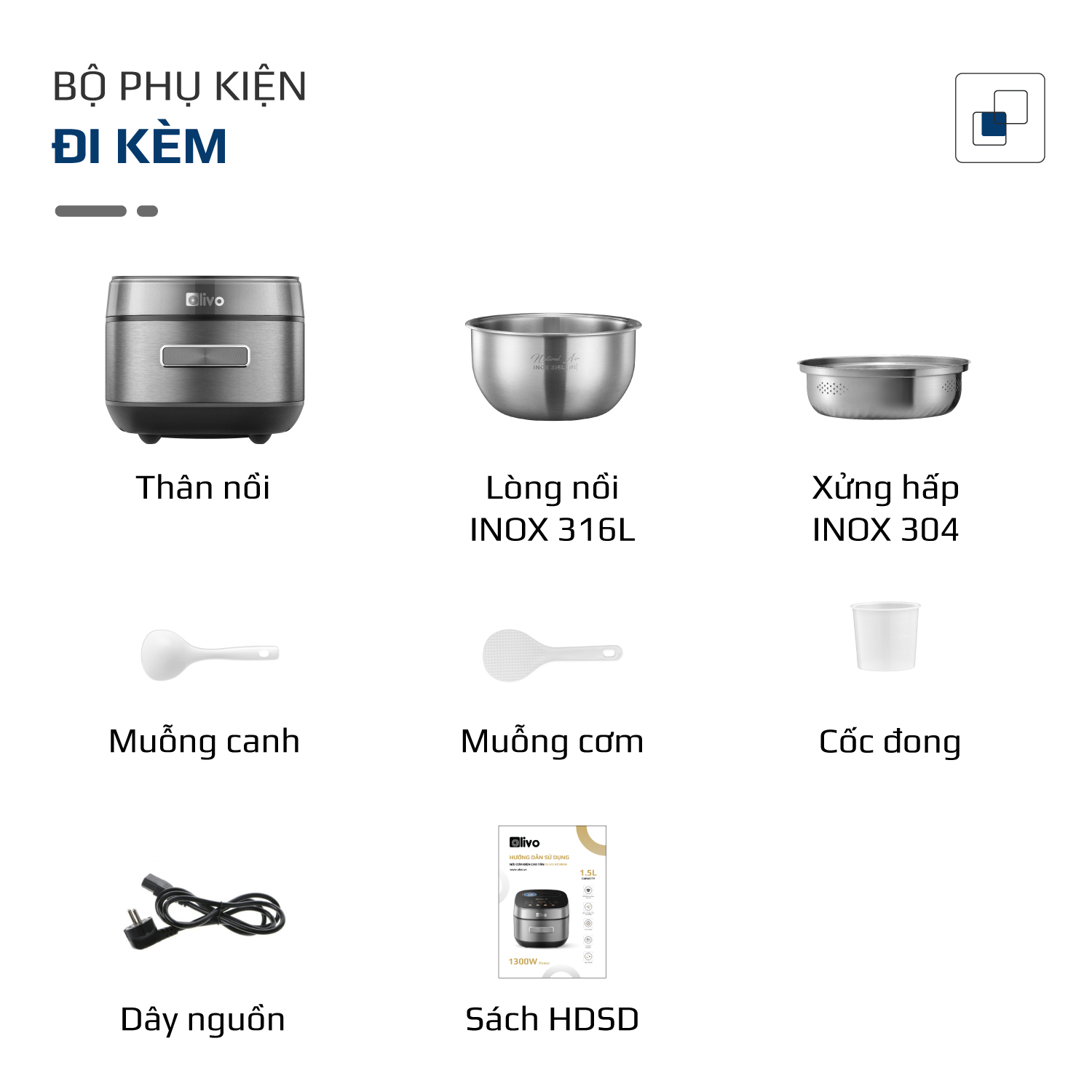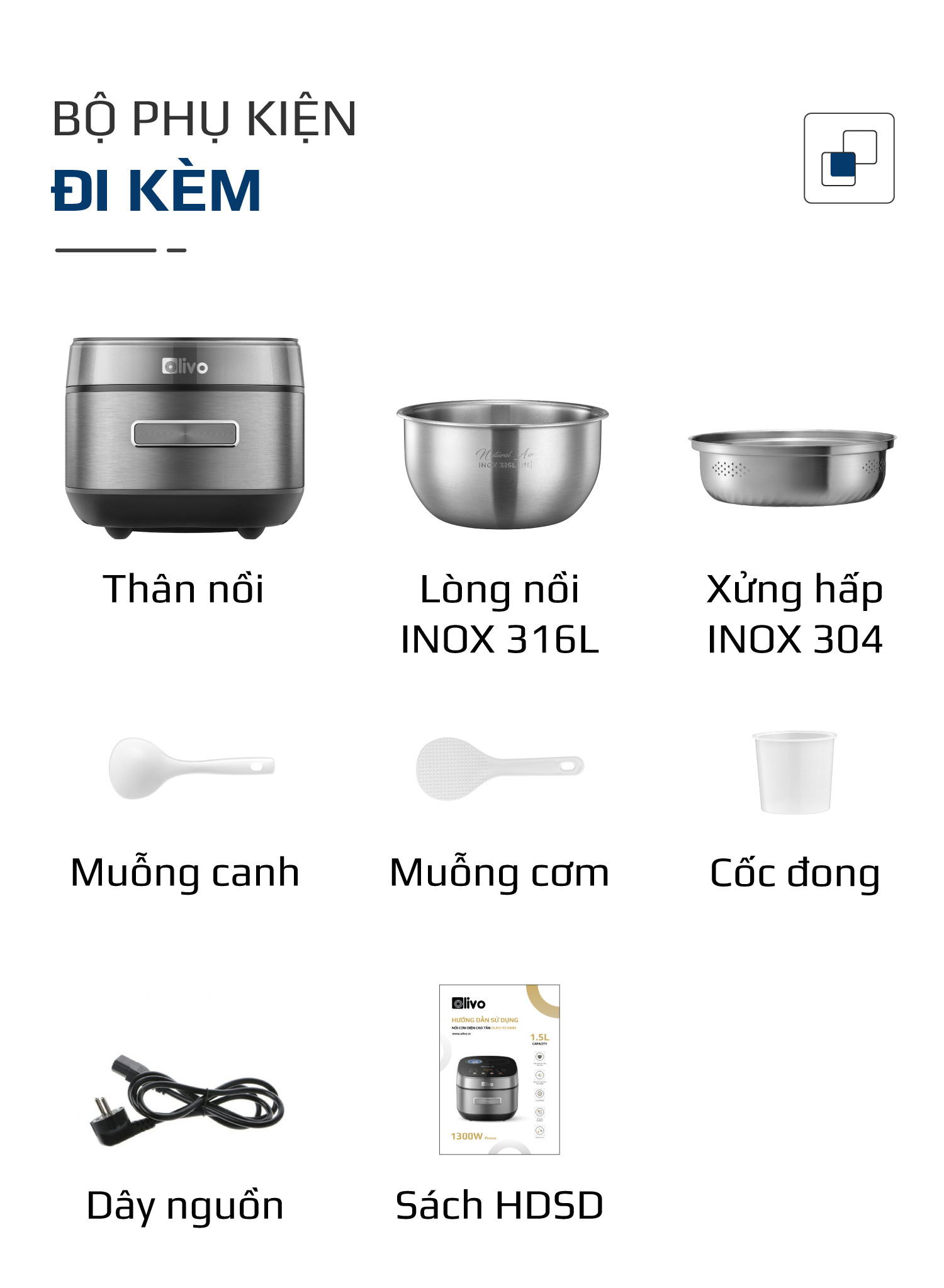 - Bộ phụ kiện đi kèm gồm xửng hấp bằng INOX 304, muỗng cơm, muỗng canh, cốc đong, dây nguồn đáp ứng mọi nhu cầu nấu nướng của bạn.