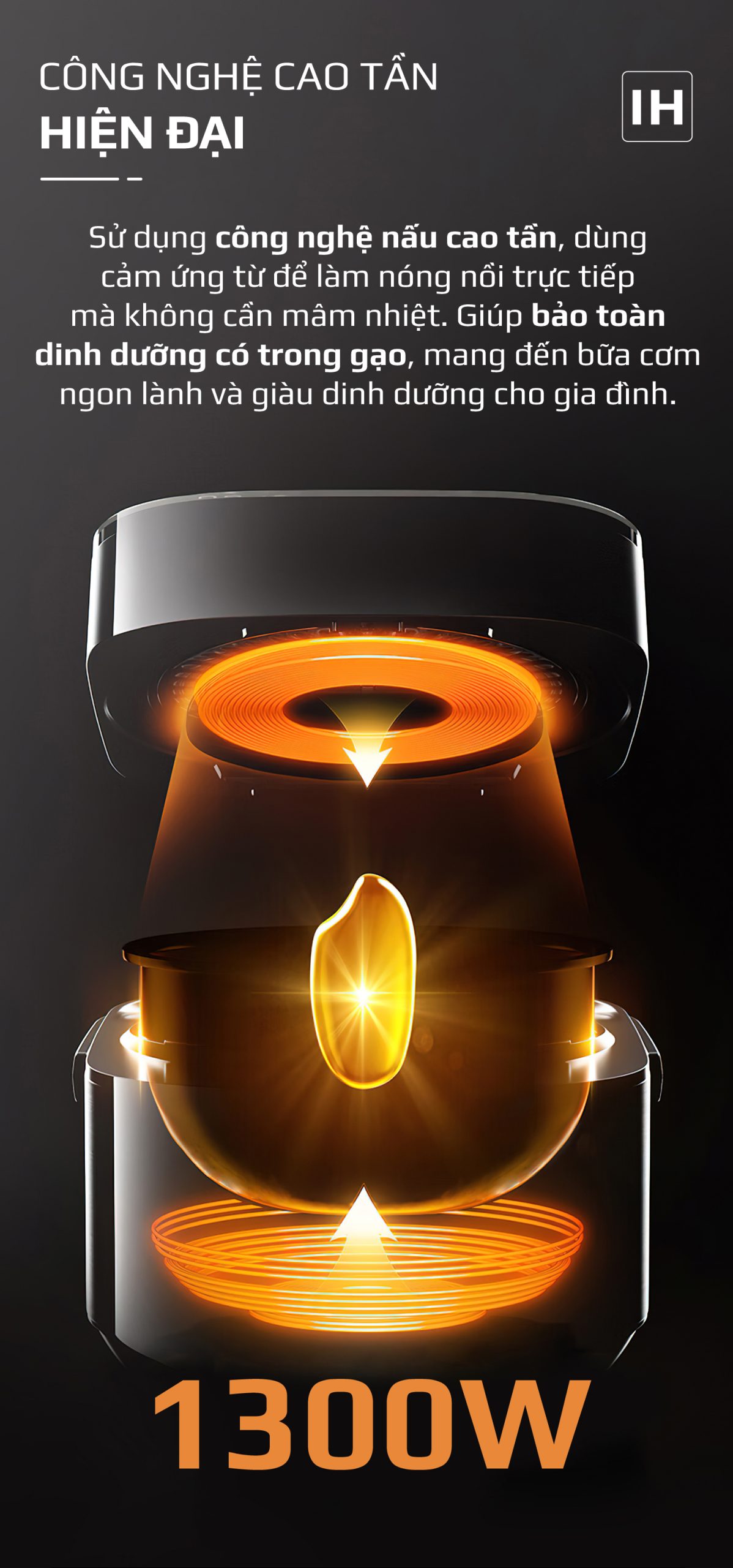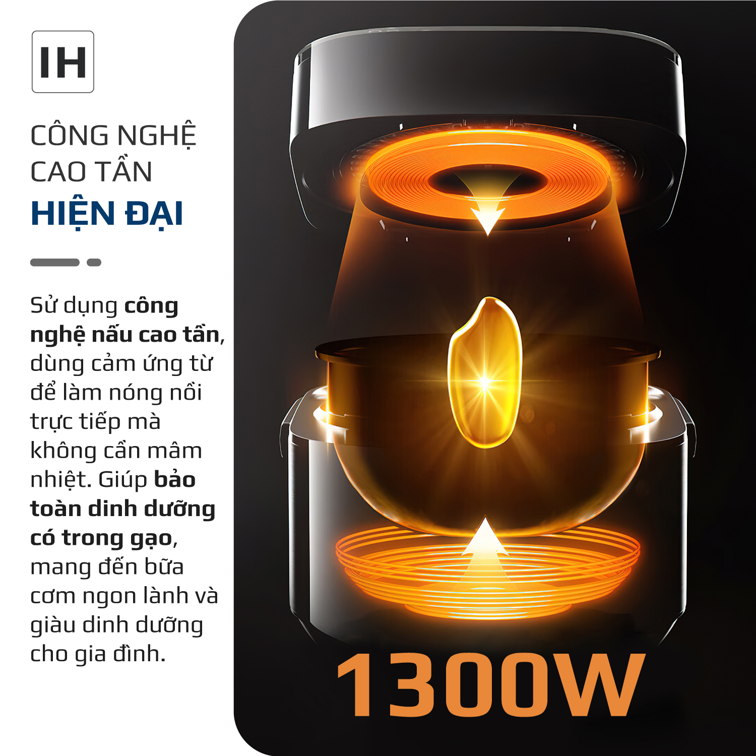 Công nghệ nấu cao tần (Induction Heating – IH) là một trong những điểm mạnh của RC900IH. Công nghệ này không chỉ gia nhiệt nhanh mà còn giúp nhiệt lượng được phân bổ đồng đều từ mọi phía