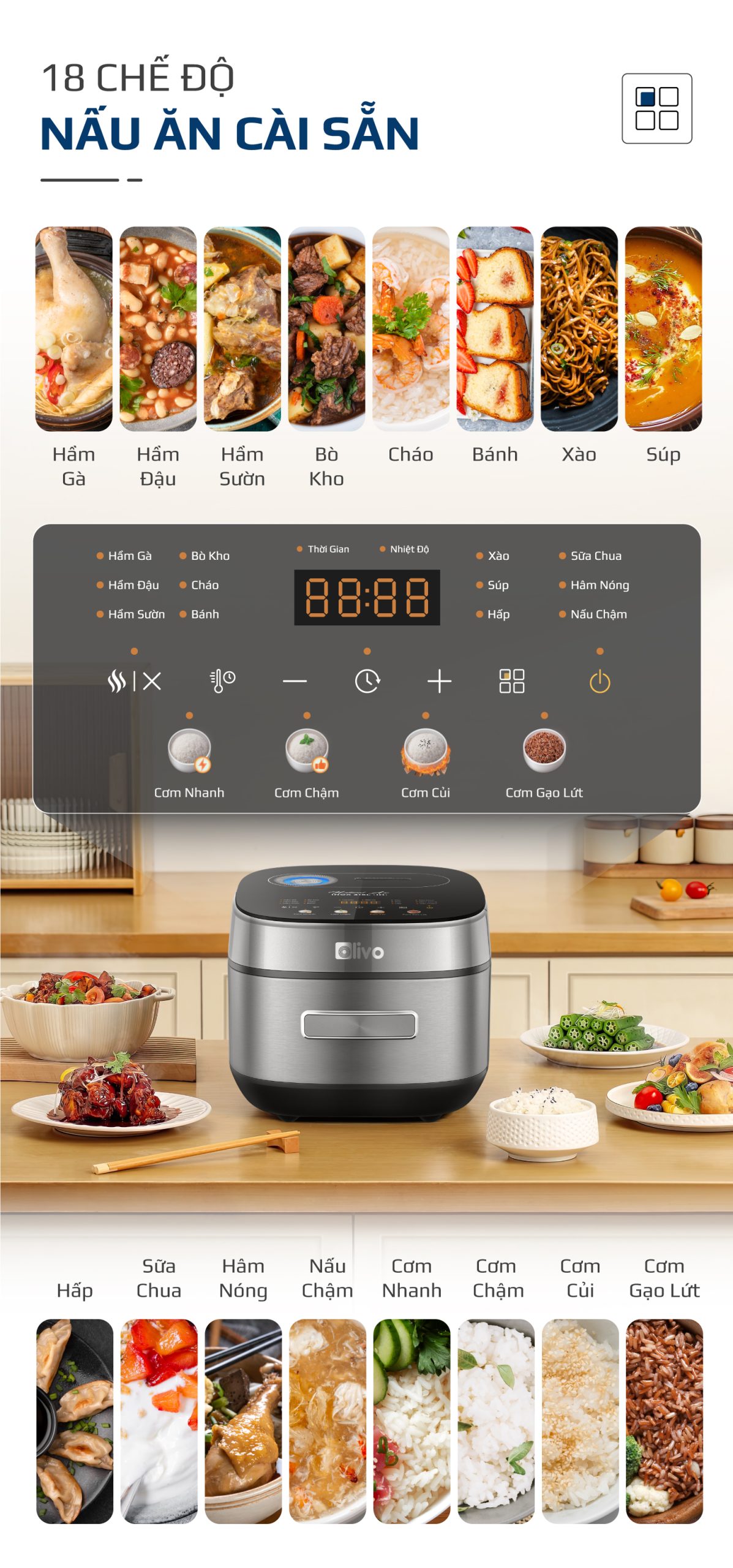 - Nồi cơm điện cao tần OLIVO RC900IH được tích hợp 18 chế độ cài đặt sẵn, giúp bạn dễ dàng chế biến các món ăn yêu thích mà không cần tốn thêm bất kỳ dụng cụ nấu bếp nào khác.