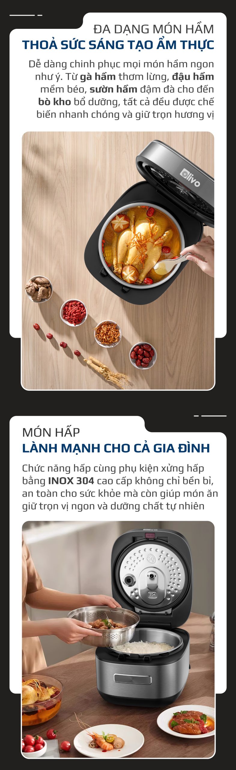Tính năng đa dạng của nồi cơm điện cao tần OLIVO RC900IH này giúp bạn tiết kiệm chi phí, không cần đầu tư thêm các thiết bị nấu nướng khác, đồng thời tối ưu không gian bếp.