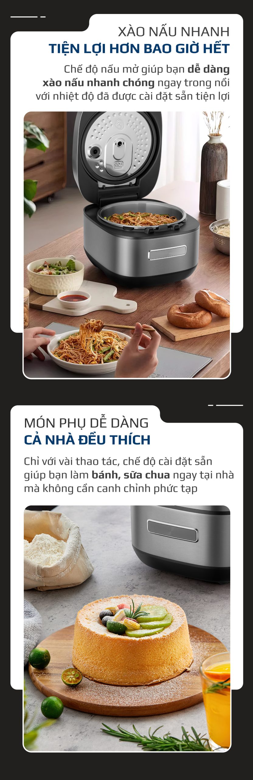 - Chế độ xào giúp dễ dàng xào nấu nhanh chóng ngay trong nồi với nhiệt độ đã được cài đặt sẵn tiện lợi, không cần dùng bếp hay xoong nồi lỉnh kỉnh