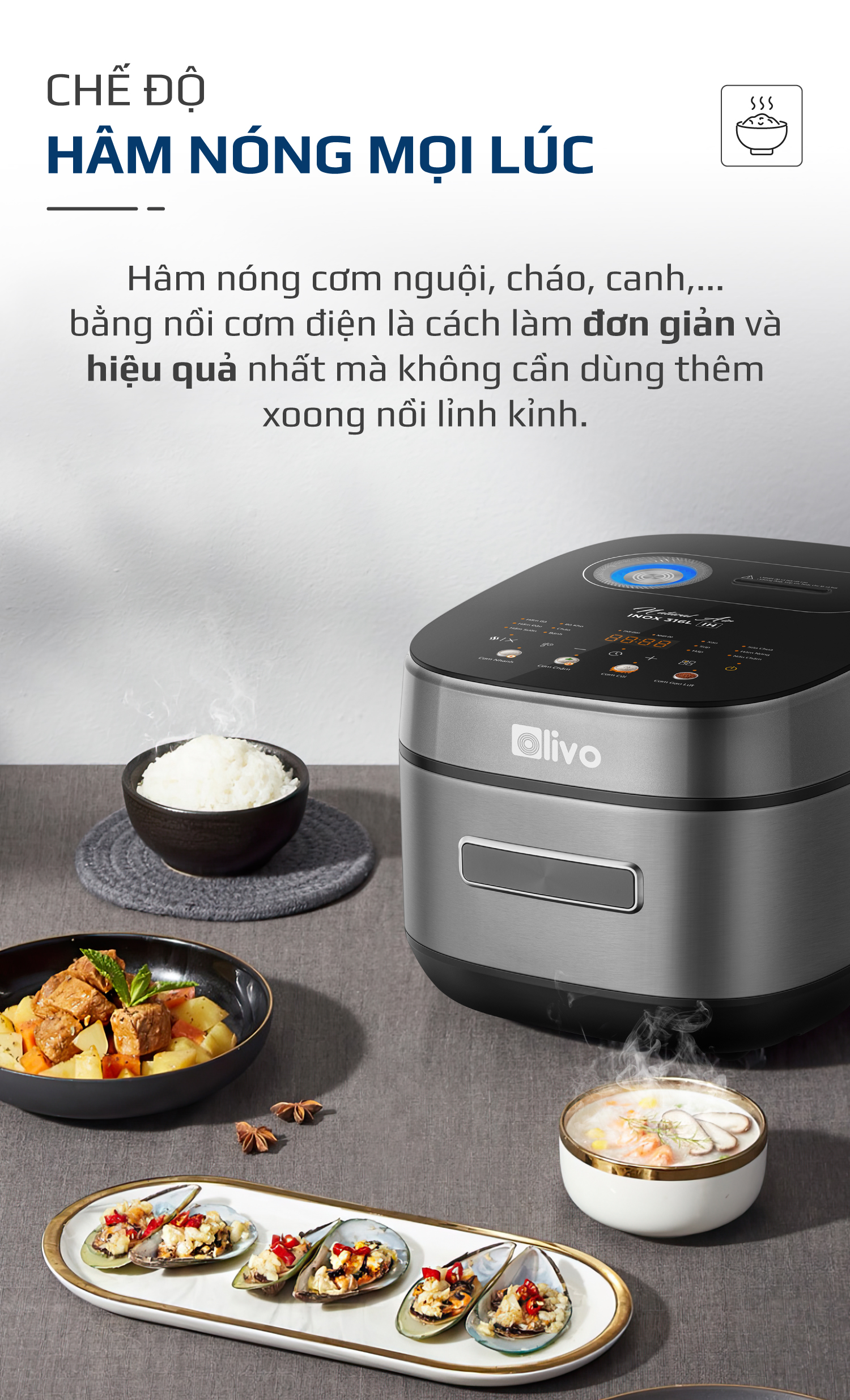 - Khả năng giữ ấm cơm lên đến 24 tiếng của nồi cơm điện cao tần OLIVO RC900IH giúp cơm luôn thơm ngon, mềm dẻo như vừa nấu.