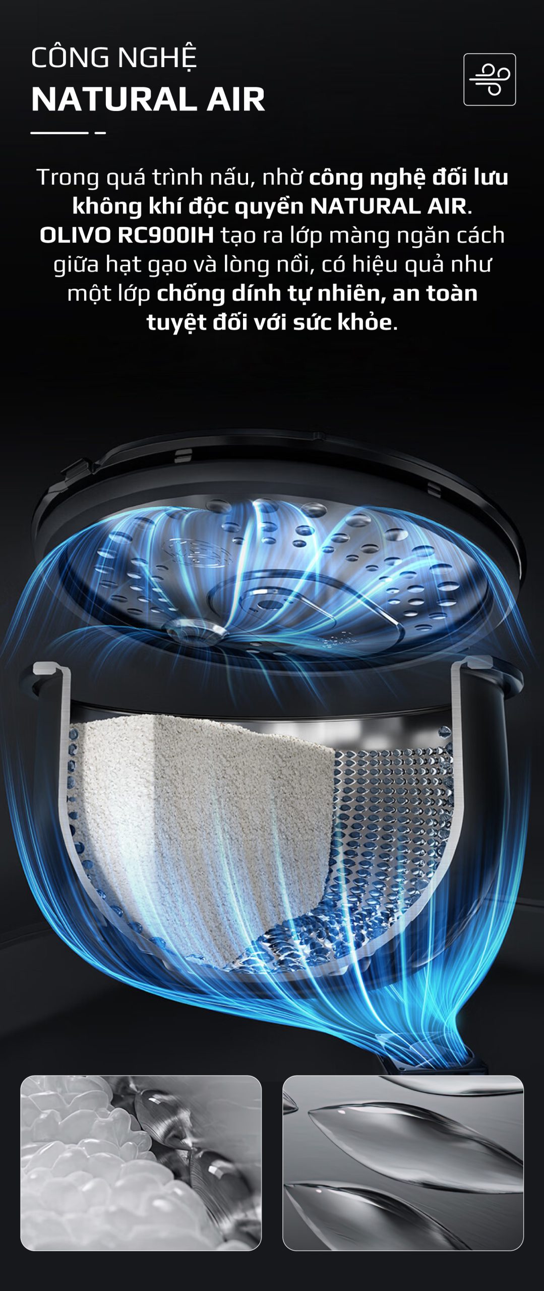- Chính vì vậy, OLIVO đã ứng dụng công nghệ đối lưu không khí độc quyền Natural Air trên sản phẩm nồi cơm điện OLIVO RC900IH. Trong quá trình hoạt động, công nghệ này sẽ giúp thiết bị tạo ra một lớp màng ngăn cách giữa hạt gạo và lòng nồi, có hiệu quả như một lớp chống dính tự nhiên vượt trội, đảm bảo món ăn không bị cháy khét, luôn giữ nguyên hương vị tuyệt vời.