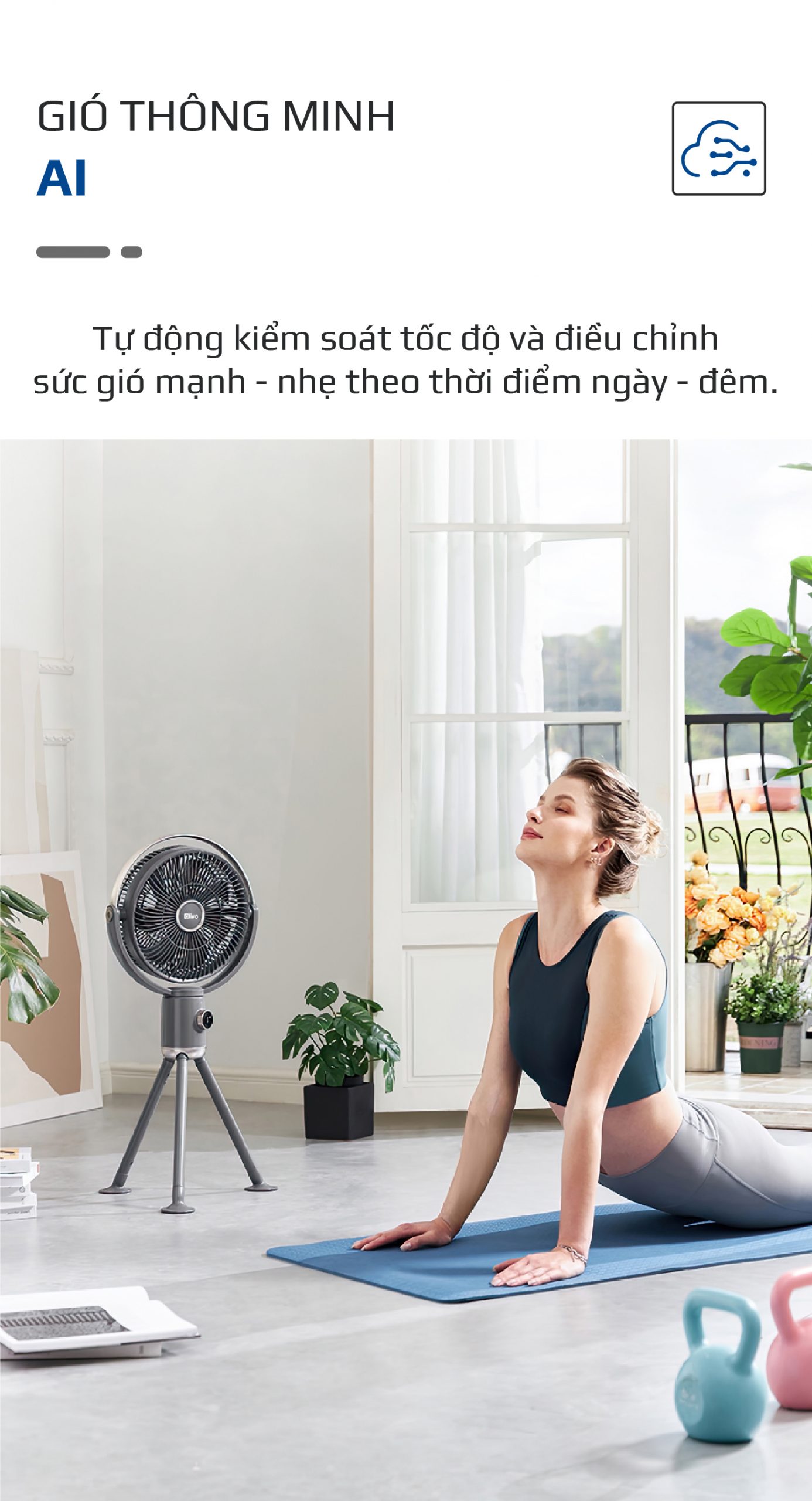 • Ngoài các chương trình điều chỉnh cấp độ gió thủ công thì sản phẩm còn trang bị thêm chức năng gió thông minh AI. Ở chế độ này quạt có thể tự động kiểm soát được tốc độ và điều chỉnh sức gió mạnh – nhẹ theo thời điểm ngày – đêm, phù hợp với thực tế mà bạn không cần điều chỉnh gì nhiều.