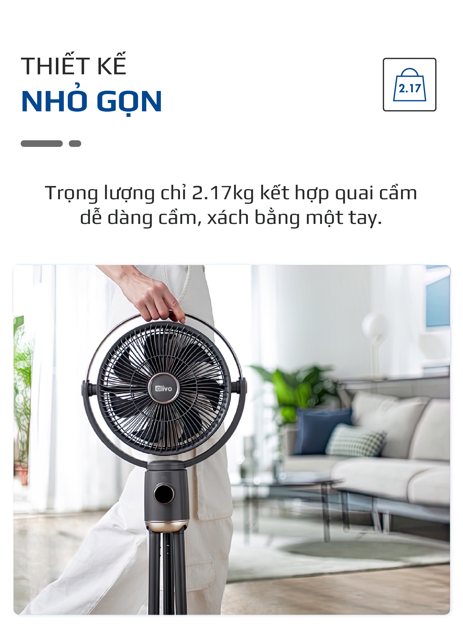• Trọng lượng chỉ 2.17Kg vô cùng nhỏ gọn, kết hợp quai cầm bạn có thể dễ dàng xách quạt bằng một tay di chuyển khắp không gian nhà.