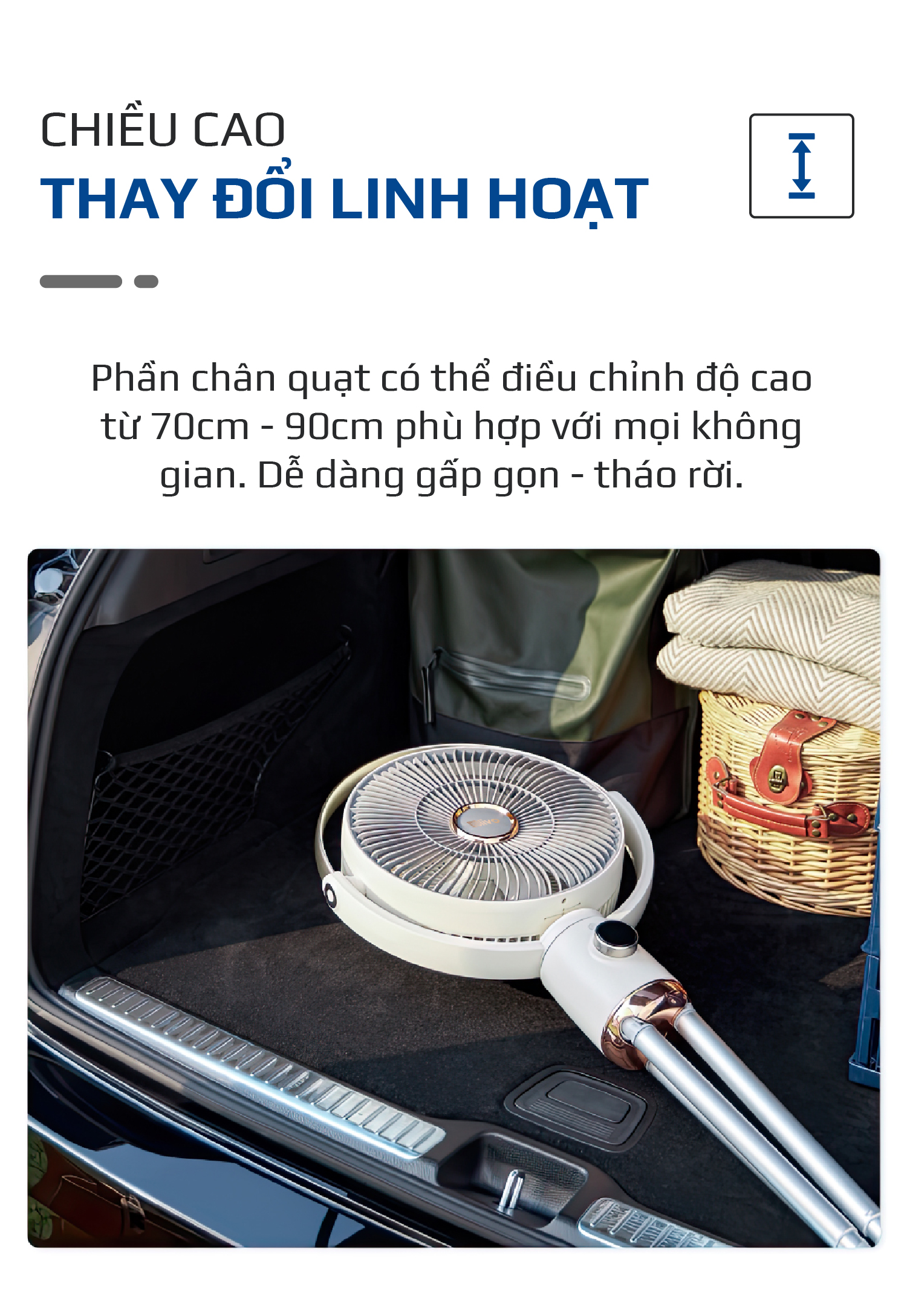 • Chiều cao có thể thay đổi được linh hoạt, phần chân quạt có thể điều chỉnh độ cao từ 70cm – 90cm dễ dàng gấp gọn và tháo rời. Có thể mang quạt theo khi gia đình đi picnic, về quê…