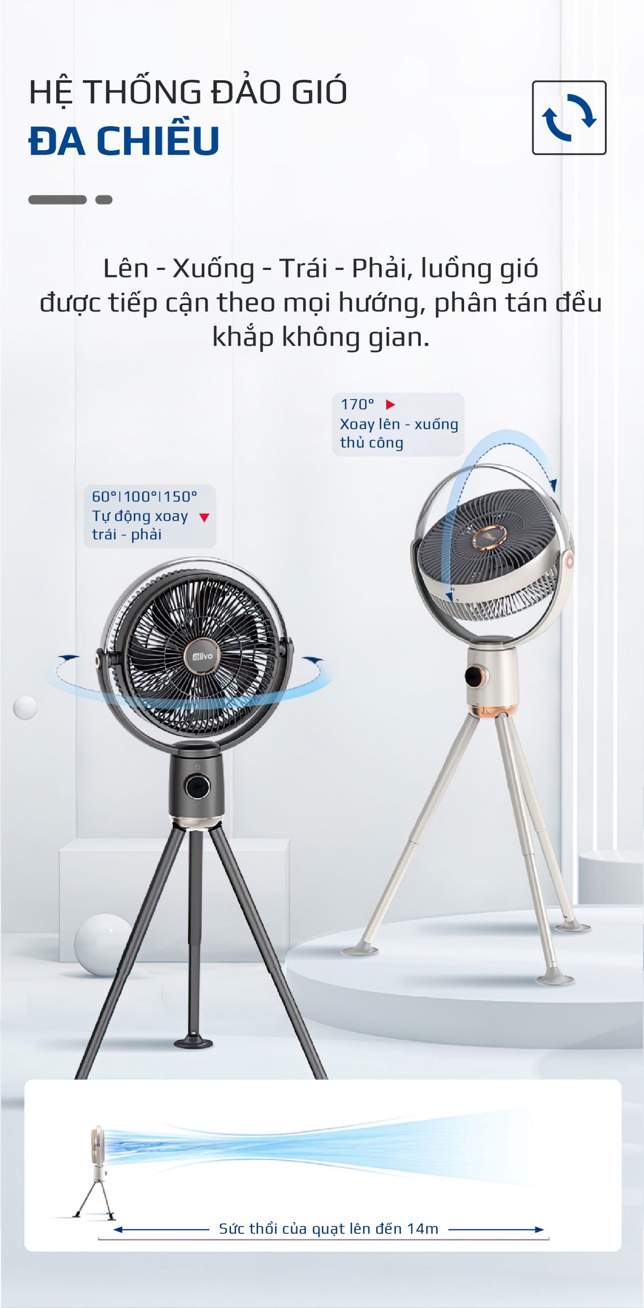 • Quạt có thể linh hoạt quay Trái – Phải ở các mức 60 độ – 110 độ – 150 độ. Xoay Lên – Xuống 170 độ.