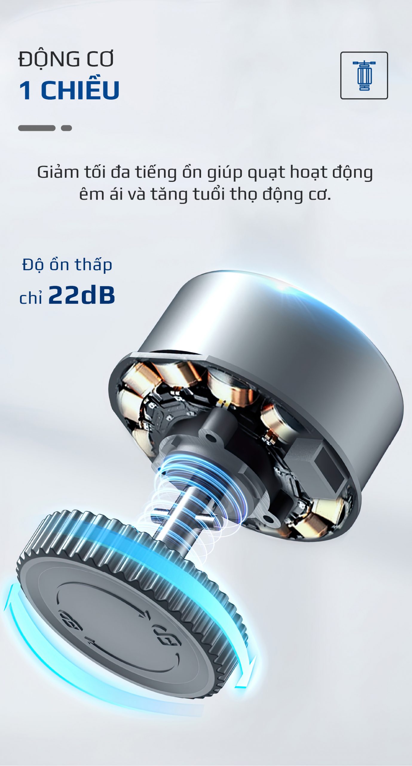 • Động cơ 1 chiều giảm tối đa tiếng ồn giúp quạt hoạt động êm ái và tăng tuổi thọ động cơ. Độ ồn rất thấp chỉ 22dB, vô cùng êm ái không ảnh hưởng đến hoạt động của bạn.