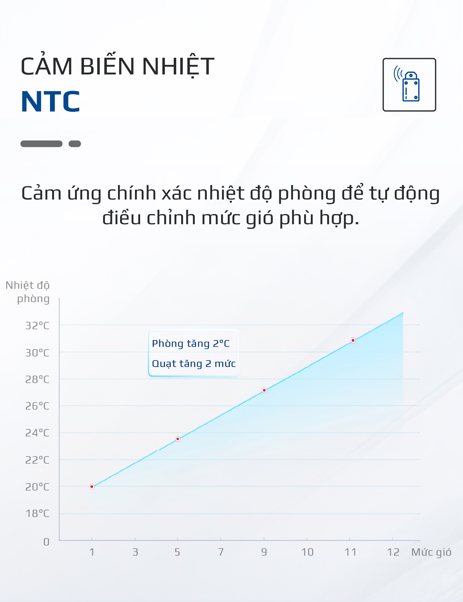 • Cảm biến nhiệt NTC cảm ứng chính xác nhiệt độ phòng để tự động điều chỉnh mức gió phù hợp với điều kiện thực tế.