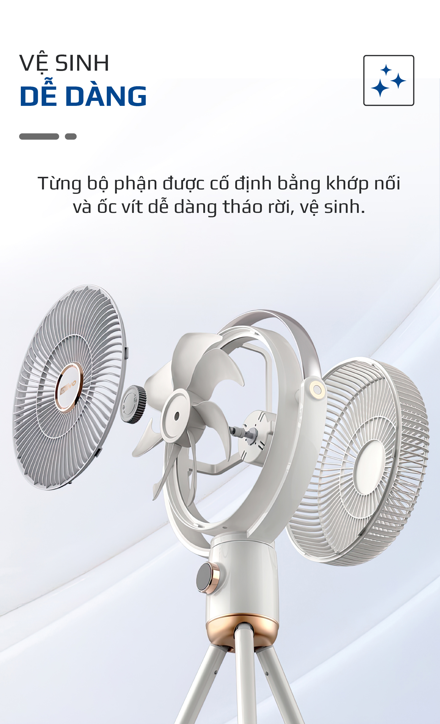 • Các bộ phận của quạt được cố định khớp nối và ốc vít dễ dàng tháo rời và vệ sinh. Đảm bảo an toàn và quạt luôn được sạch sẽ để mang đến cho bạn và gia đình làn gió chất lượng nhất.