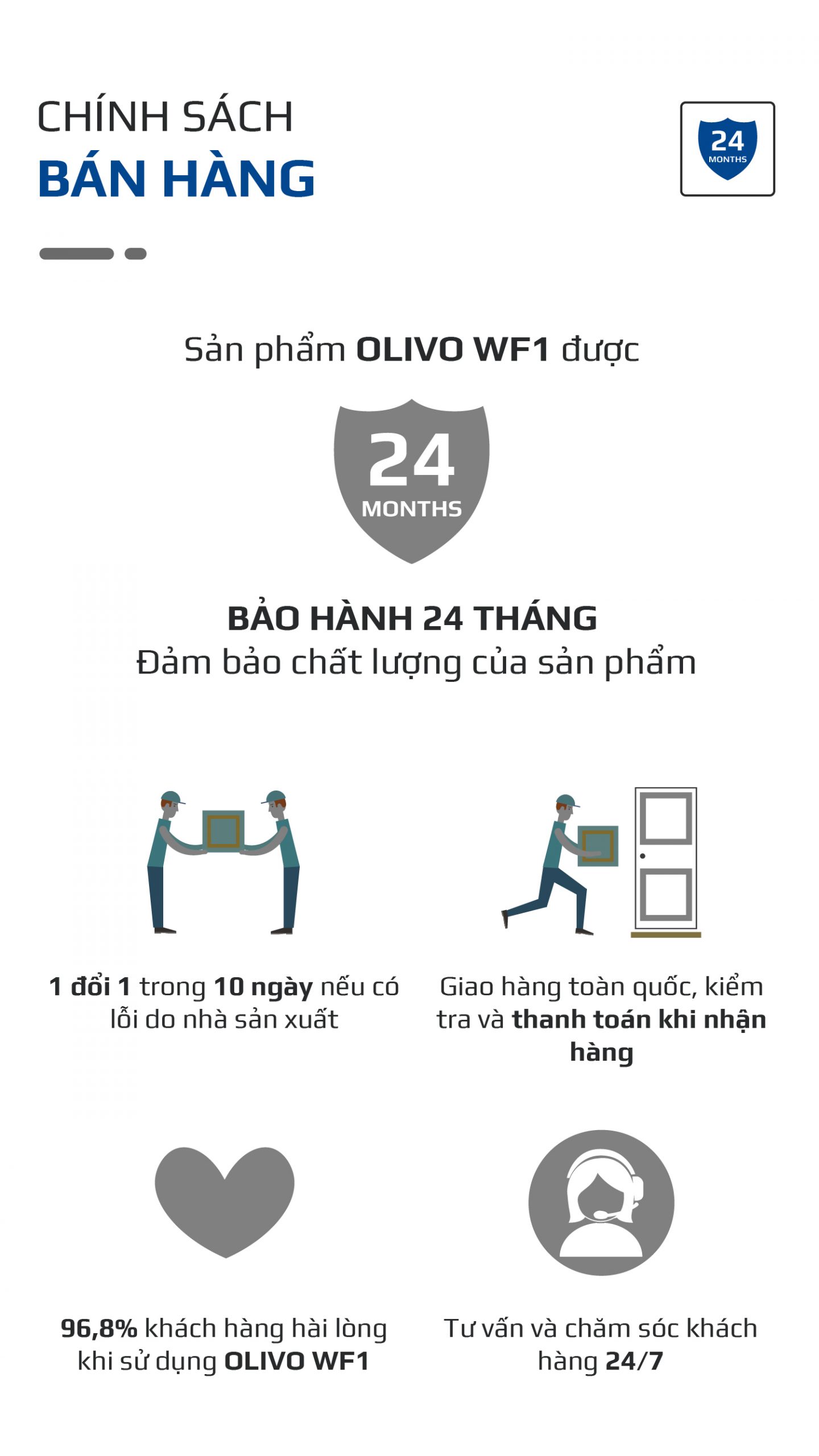 • OLIVO WF1 là sự kết hợp hoàn hảo giữa thiết kế tinh tế, cao cấp và ứng dụng công nghệ hiện đại tiên tiến nhất thể hiện qua các tính năng cài đặt sẵn của sản phẩm.