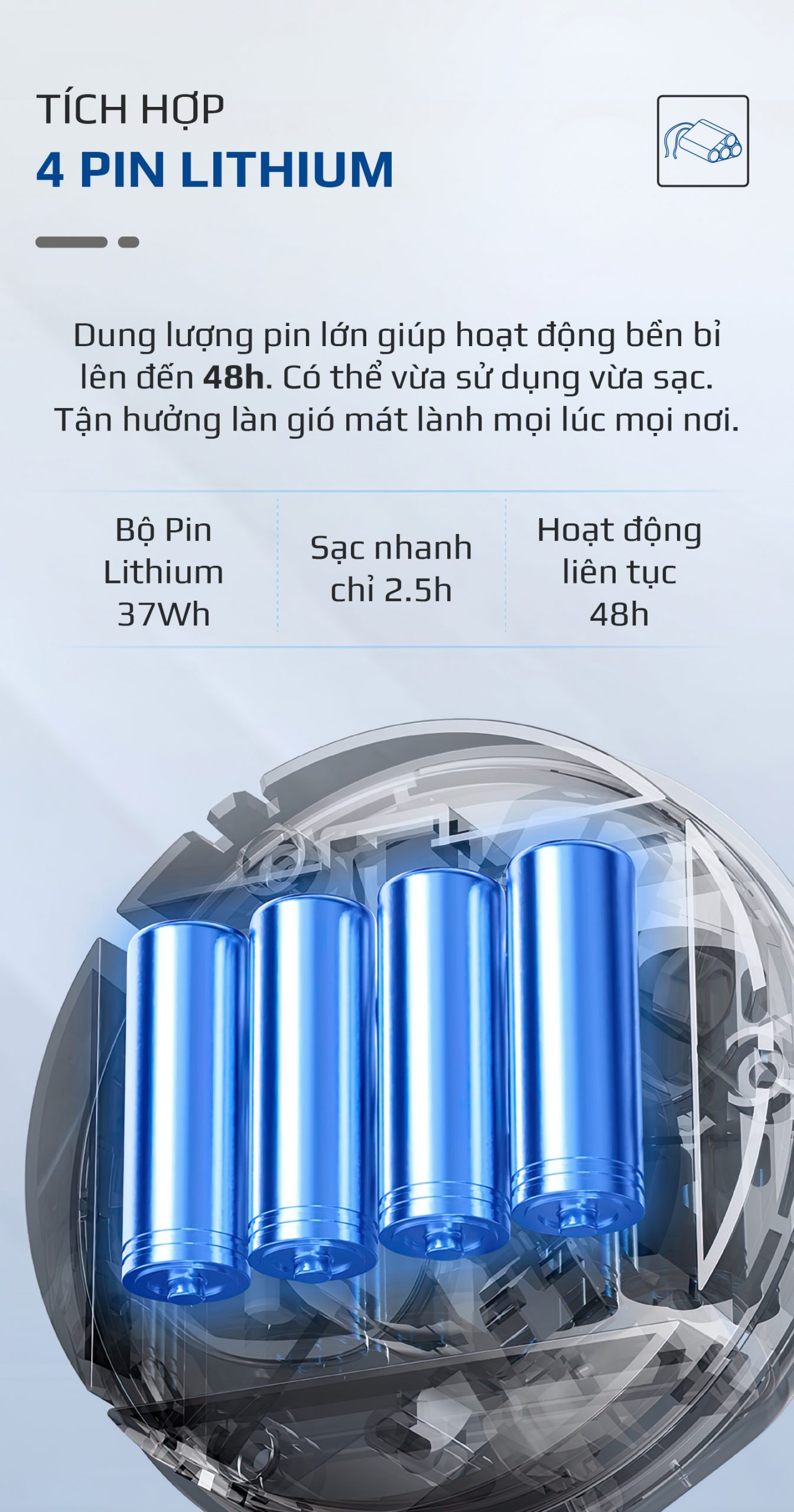 • Dung lượng pin lớn giúp quạt hoạt động bền bỉ lên đến 48 giờ. Giúp bạn tận hưởng làn gió mát lành mọi lúc mọi nơi, yên tâm ngủ ngon dù có mất điện đột ngột.