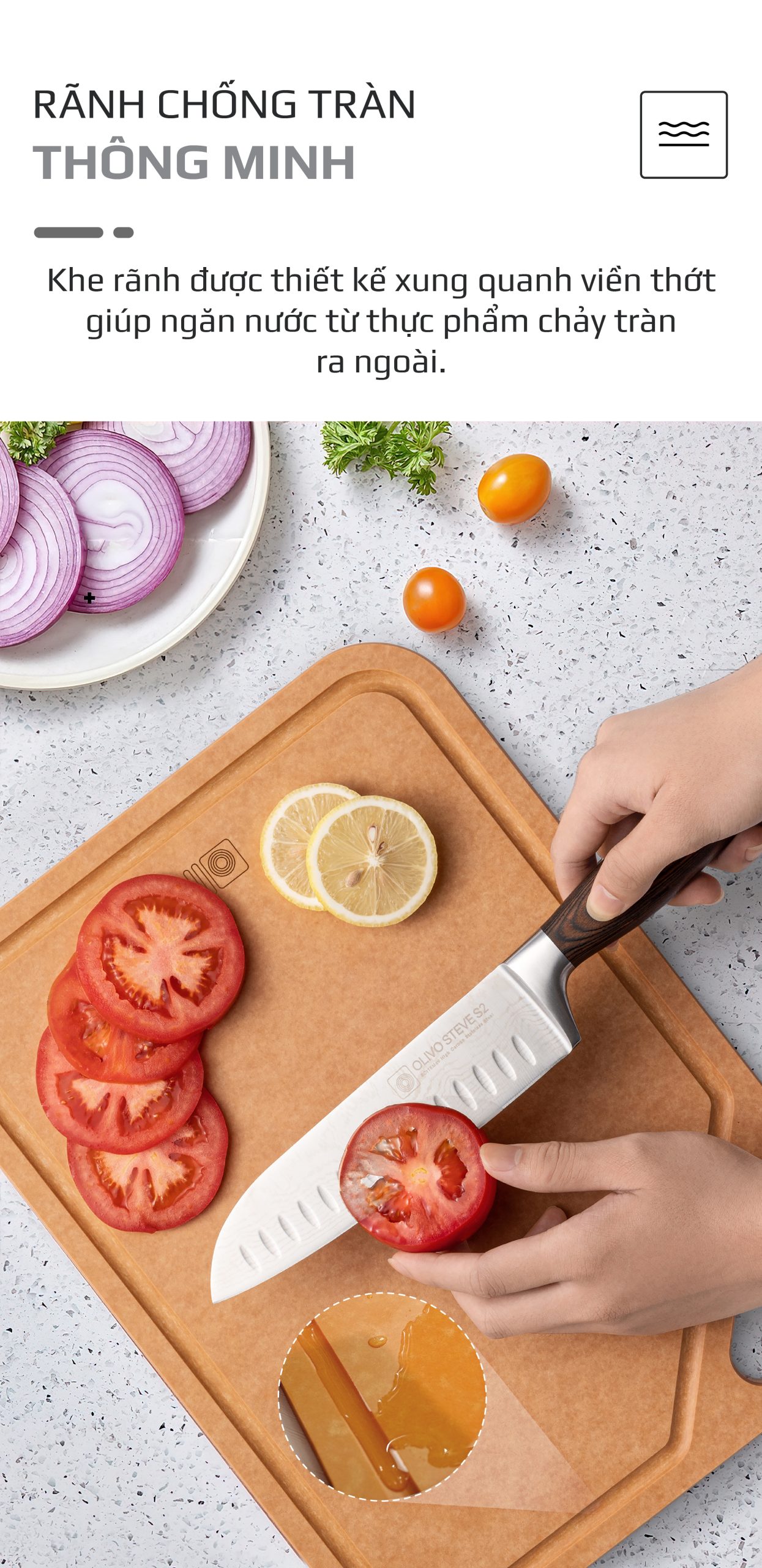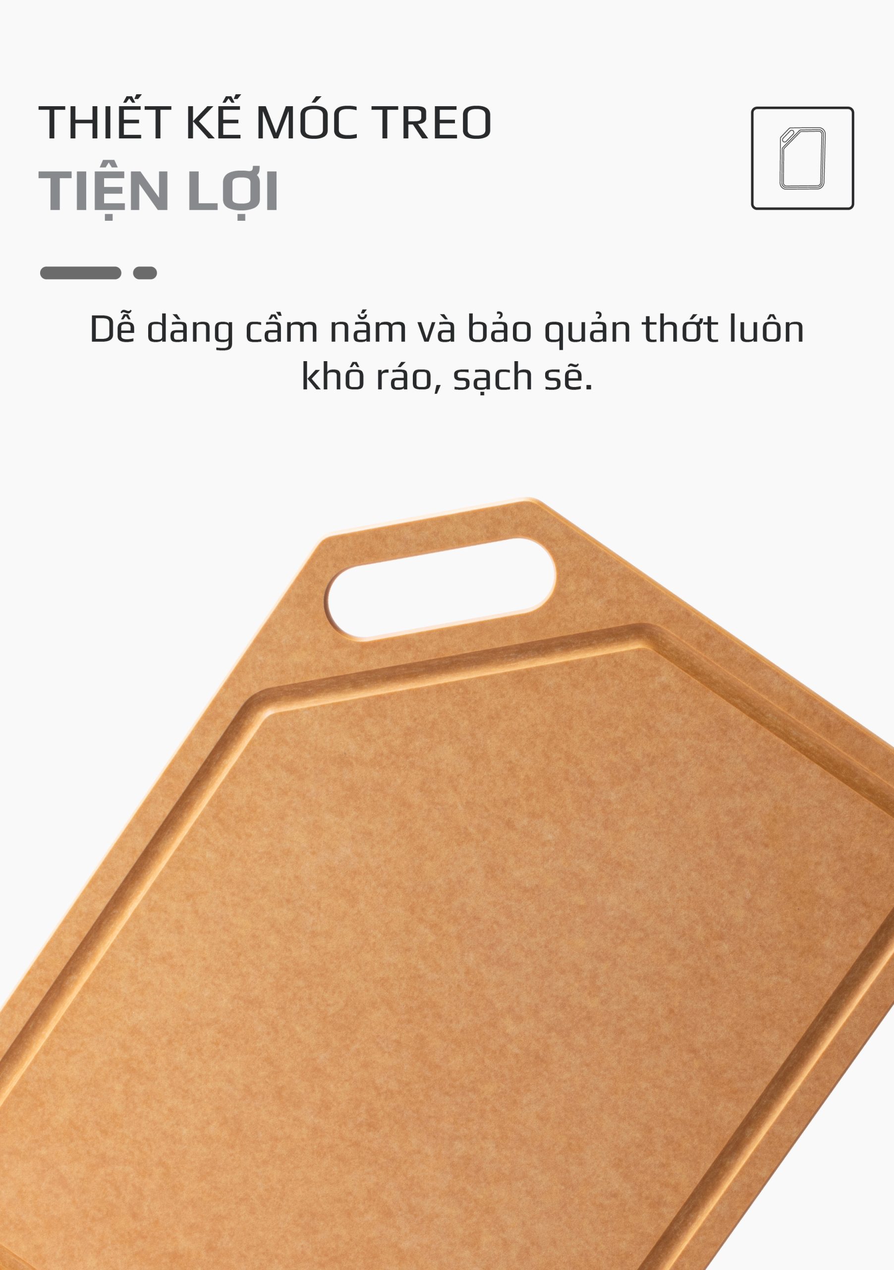 - Rãnh chống tràn thông minh xung quanh viền thớt đảm bảo nước từ thực phẩm không chảy tràn ra mặt bếp. Có móc treo thớt tiện lợi giúp dễ dàng sử dụng và bảo quản thớt luôn khô ráo, sạch sẽ.