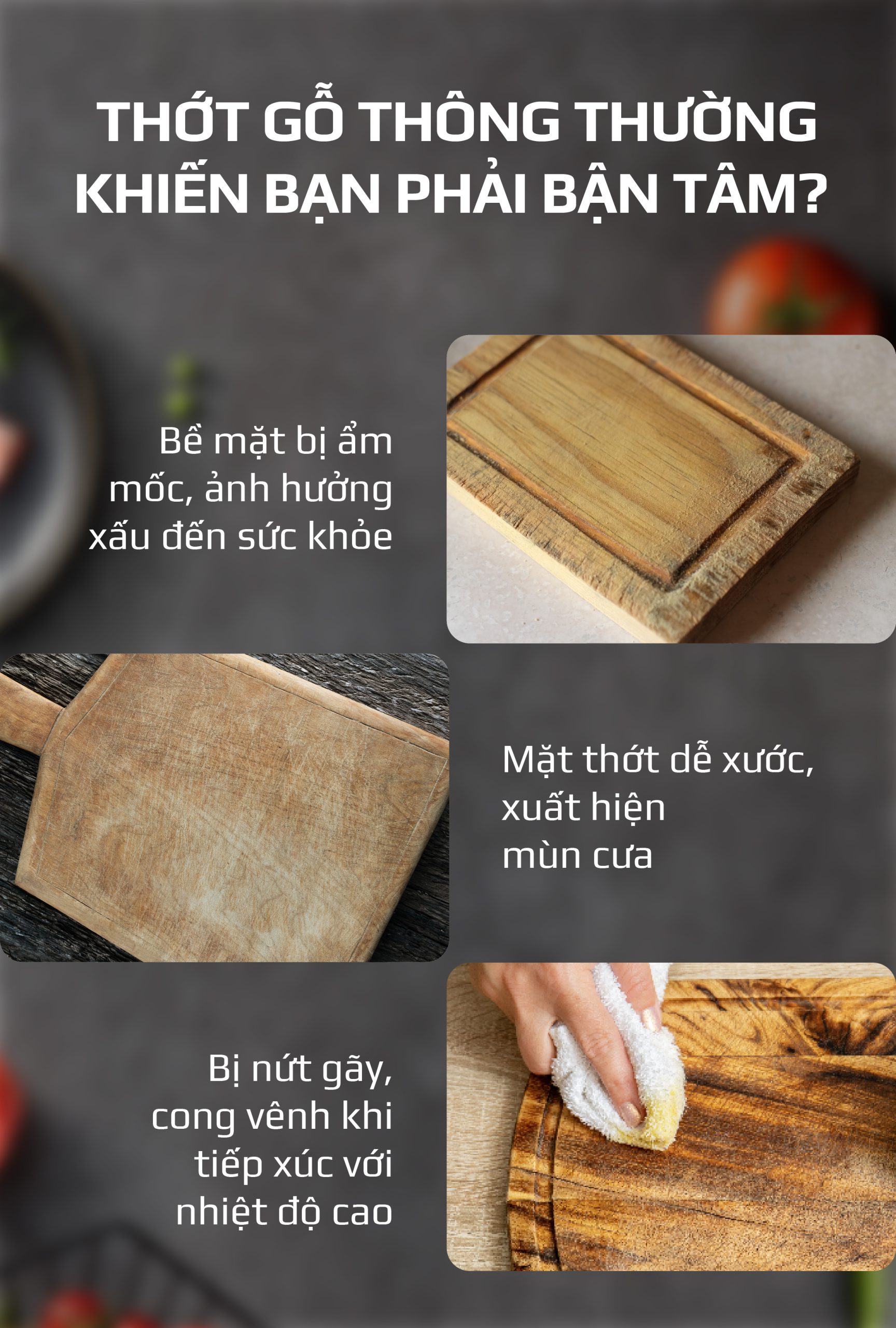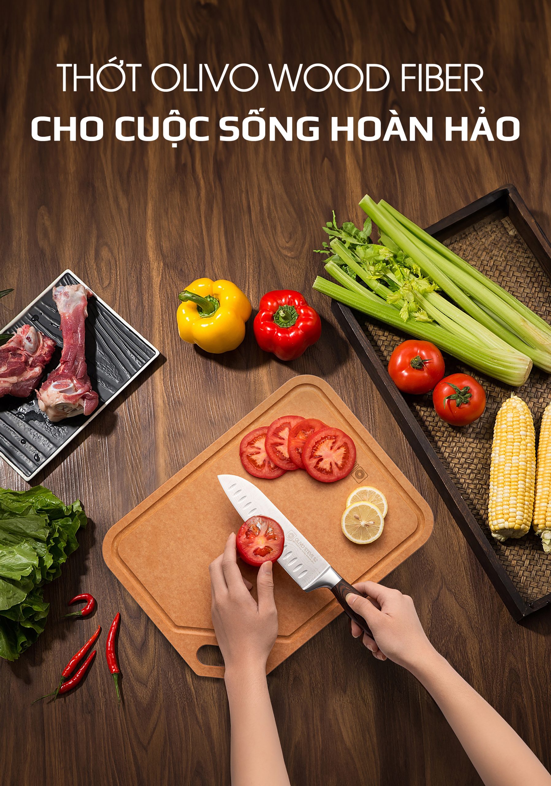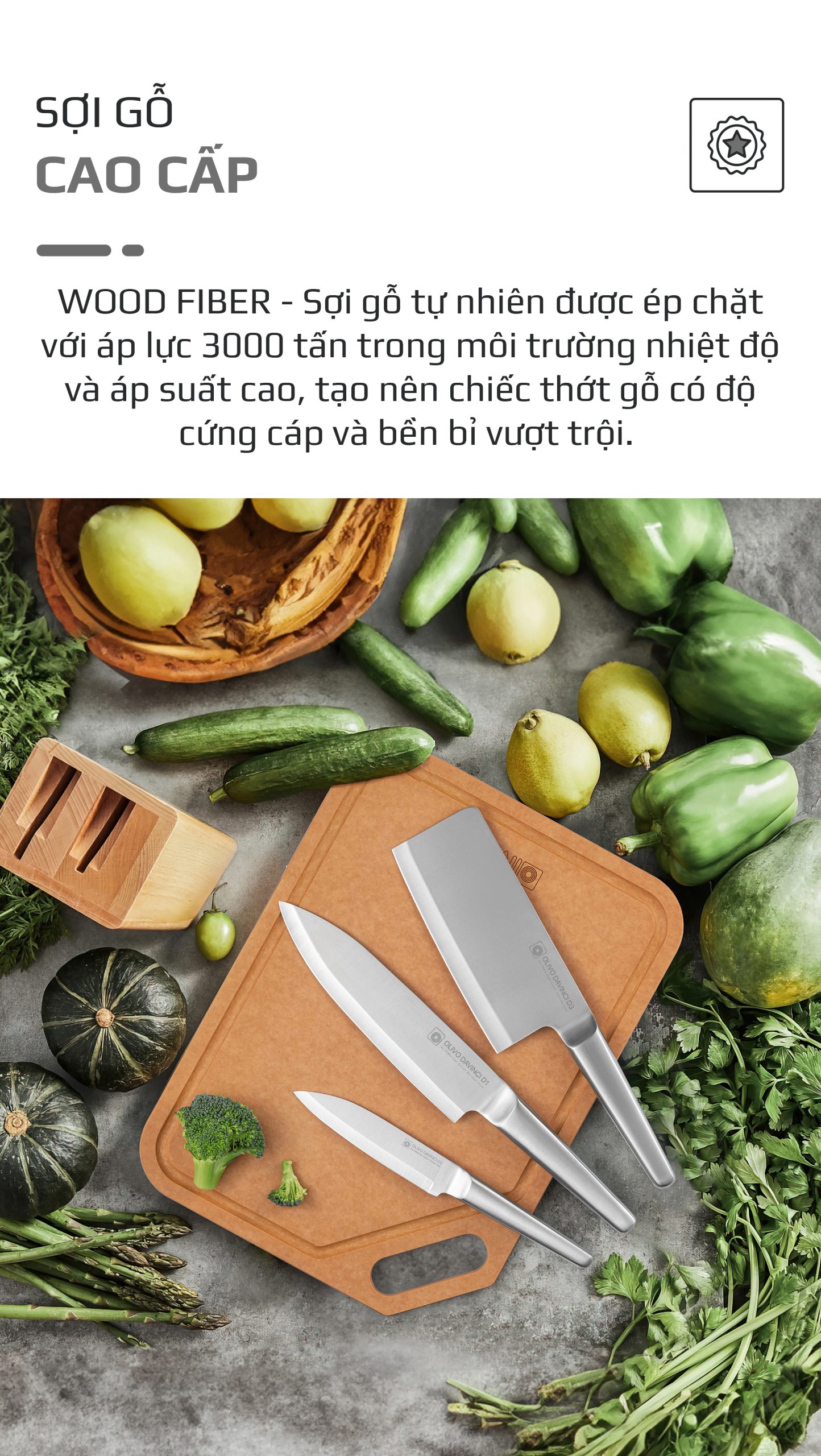 - WOOD FIBER – Sợi gỗ tự nhiên được ép chặt với áp lực 3000 tấn trong môi trường nhiệt độ và áp suất cao, tạo nên chiếc thớt gỗ có độ cứng cáp và bền bỉ vượt trội.