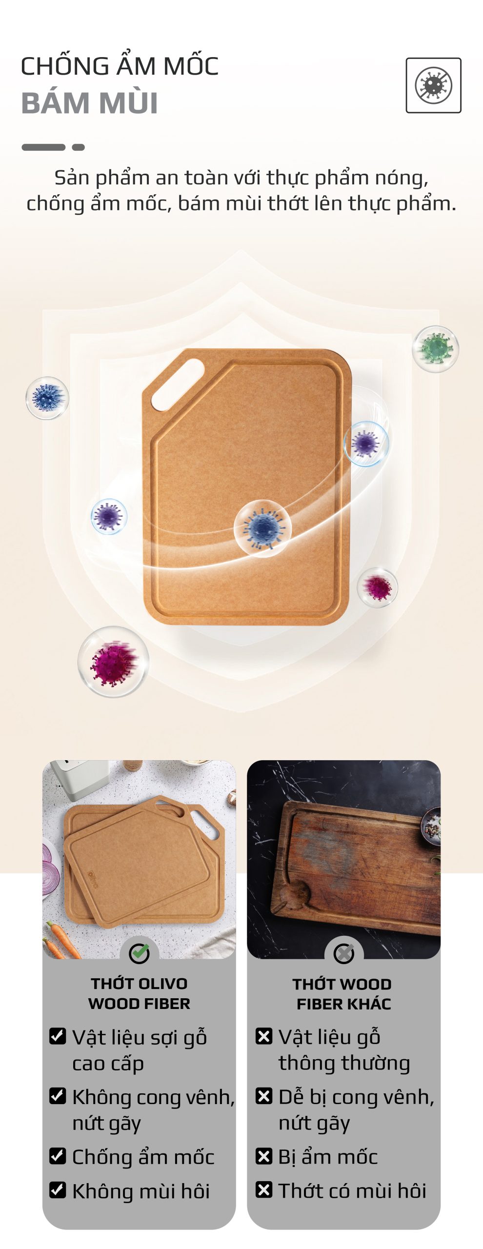 - Sản phẩm an toàn với thực phẩm nóng, có thể sử dụng trực tiếp đồ ăn trên thớt. Thớt được làm từ vật liệu sợi gỗ cao cấp đảm bảo không cong vênh, ẩm mốc, không bị mùn thớt và không có mùi hôi.